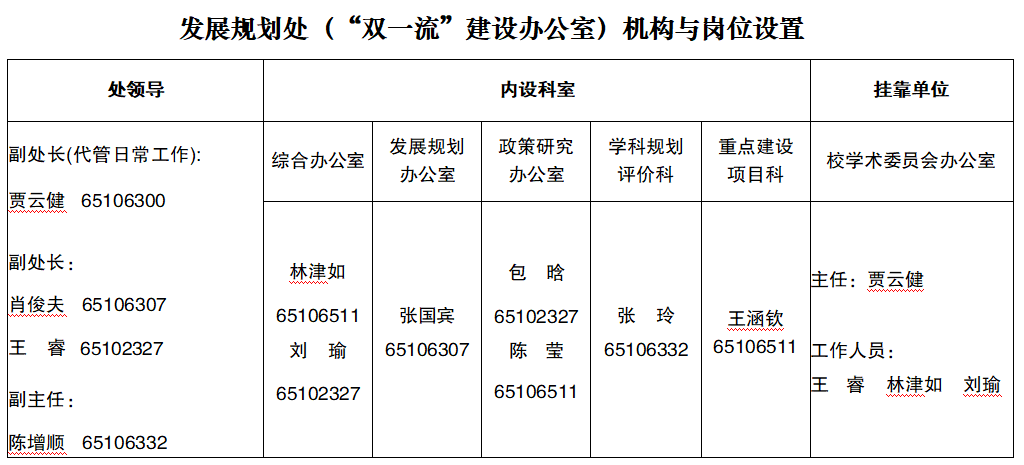 发展规划处成立于2014年7月,是在学校党委和行政领导下,为学校事业发展提供决策参谋与咨询,研究论证学校重大改革决策,统筹推进协调“双一流”建设任务,管理监控规划实施,组织开展高等教育战略规划与管理研究、教育事业统计工作等,为学校改革与发展出谋划策的职能部门。校学术委员会办公室和学科建设专门委员会办公室挂靠发展规划处。2018年11月,学校成立“双一流”建设办公室,正处级建制,与发展规划处合署办公。